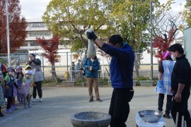 園庭に出る前に、みんなで蒸しあがったもち米を「これがお餅にになるんだよ!」と試食しました。