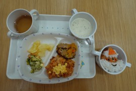 給食は「チキンライス」「ミートローフ」「いろどりサラダ」